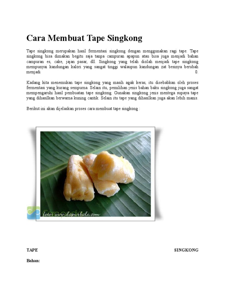 Pada proses pembuatan tape, jamur ragi akan memakan glukosa yang ada di dalam singkong sebagai makanan untuk pertumbuhannya, sehingga singkong akan menjadi lunak, jamur tersebut akan merubah glukosa menjadi alkohol. Alkisah dibalik pembuatan tape ini adalah. 2 sdm mentega cair atau bisa pakai 50 gram mentega cair; Jika anda ingin membuat tape singkong sendiri dirumah silahkan bisa dicoba. 4 hours ago · 100 gram tape singkong;